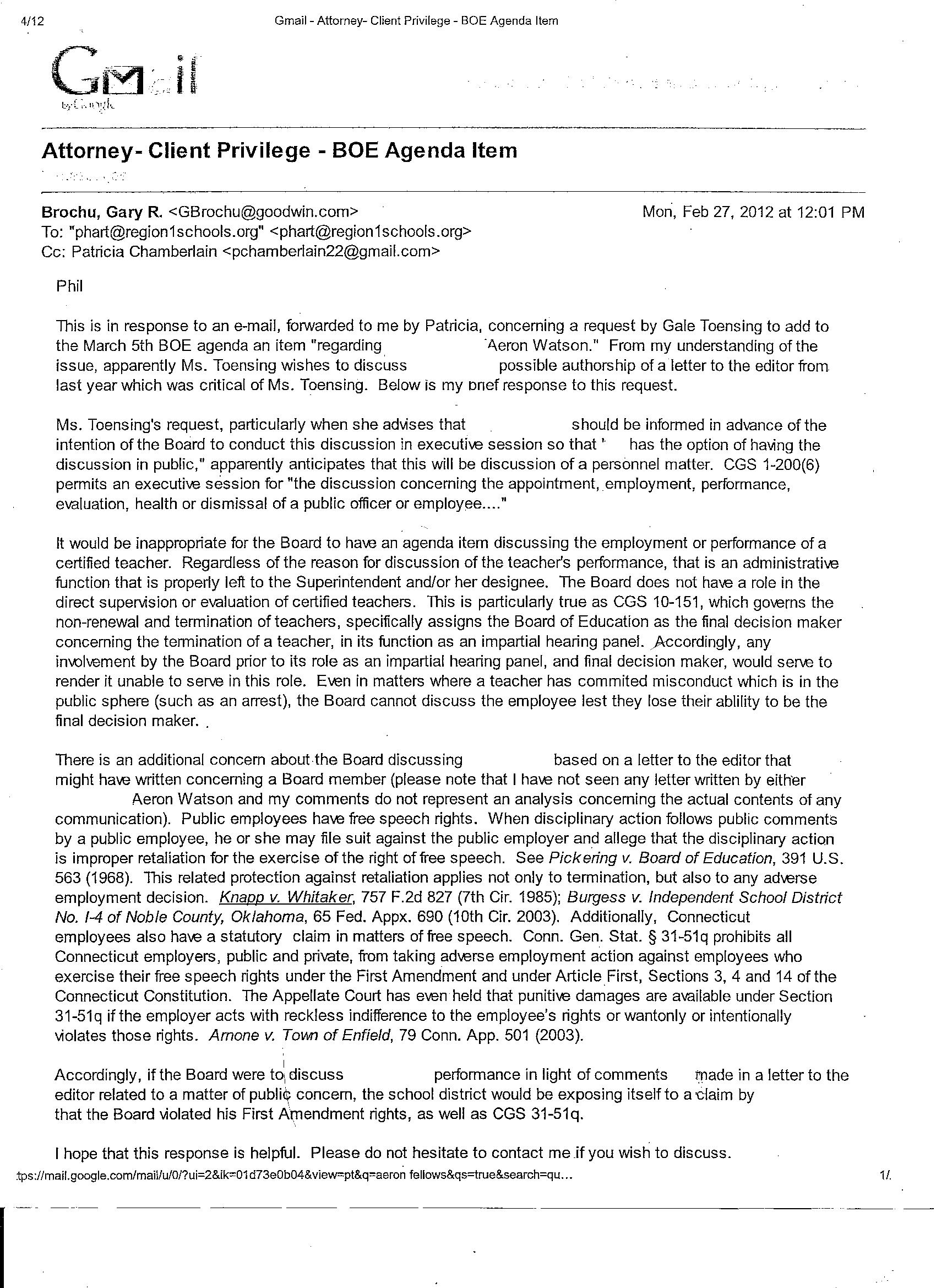 So, at the end of the Region One Board Of Education meeting on June 4th I asked Phil Hart, Chair of the board, re: The Aeron Watson (Scott Fellows) letter, who was the attorney and who was the client in the attorney/client privilege claim made by the board and it’s attorney against Gale Toensing? I was told the client for the attorney was the board.